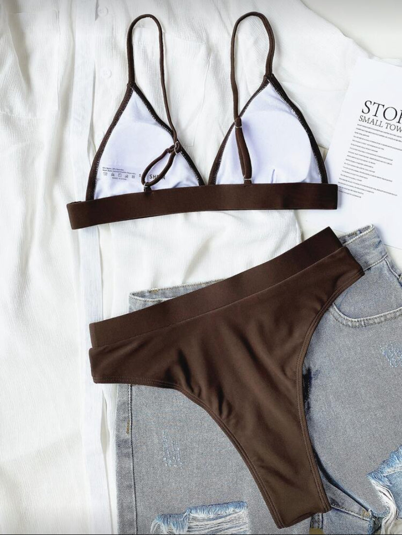 • Conjunto de duas peças: top triangular + calcinha de cintura alta